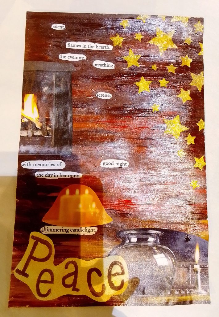 Found poetry is the art of taking a piece of text, and searching for a poem or sentiment within. Once this has been found, we then illustrate the poem, using drawing, paints, collage, rubber stamps, whatever works best for you.