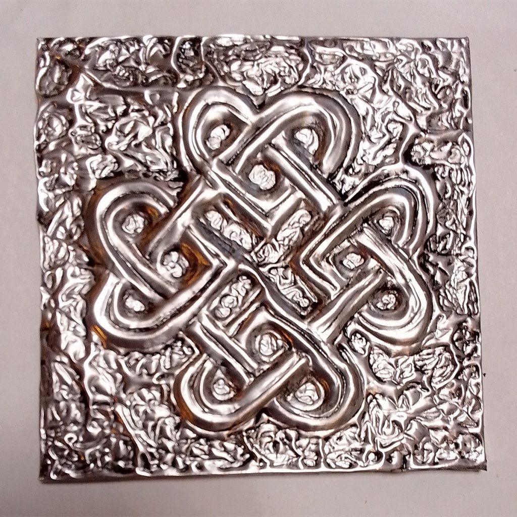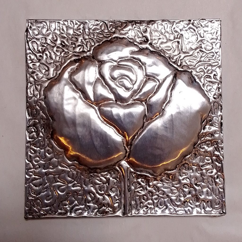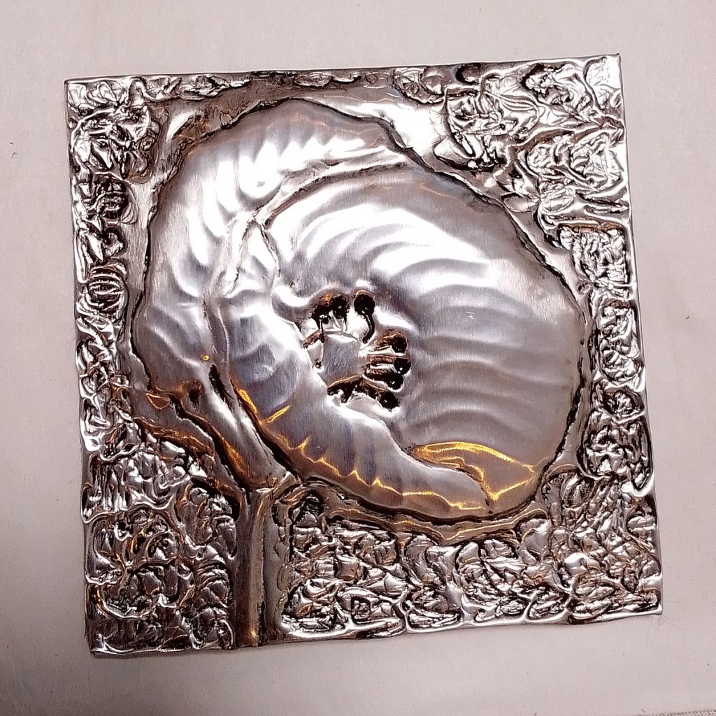 Four decorative coasters / tiles made on today’s private metal embossing workshop in my studio. It was a great workshop with a mum and daughter. We went through a few basic techniques first of all, working on a practice piece, and then moved on to creating the coasters, learning a few more techniques along the way.