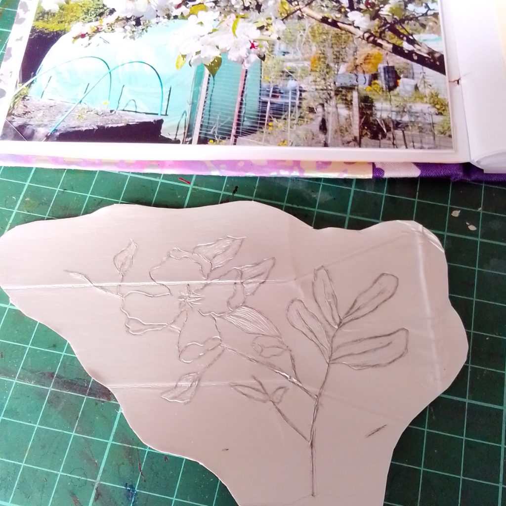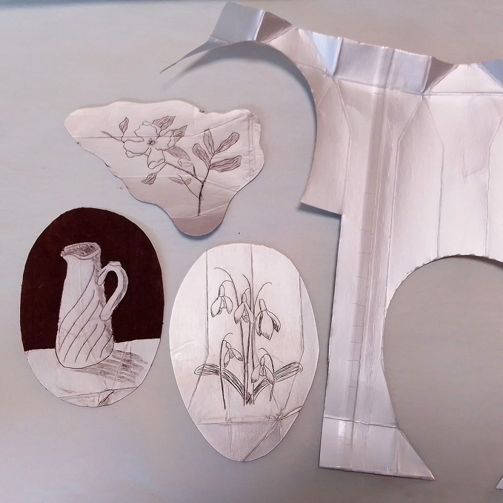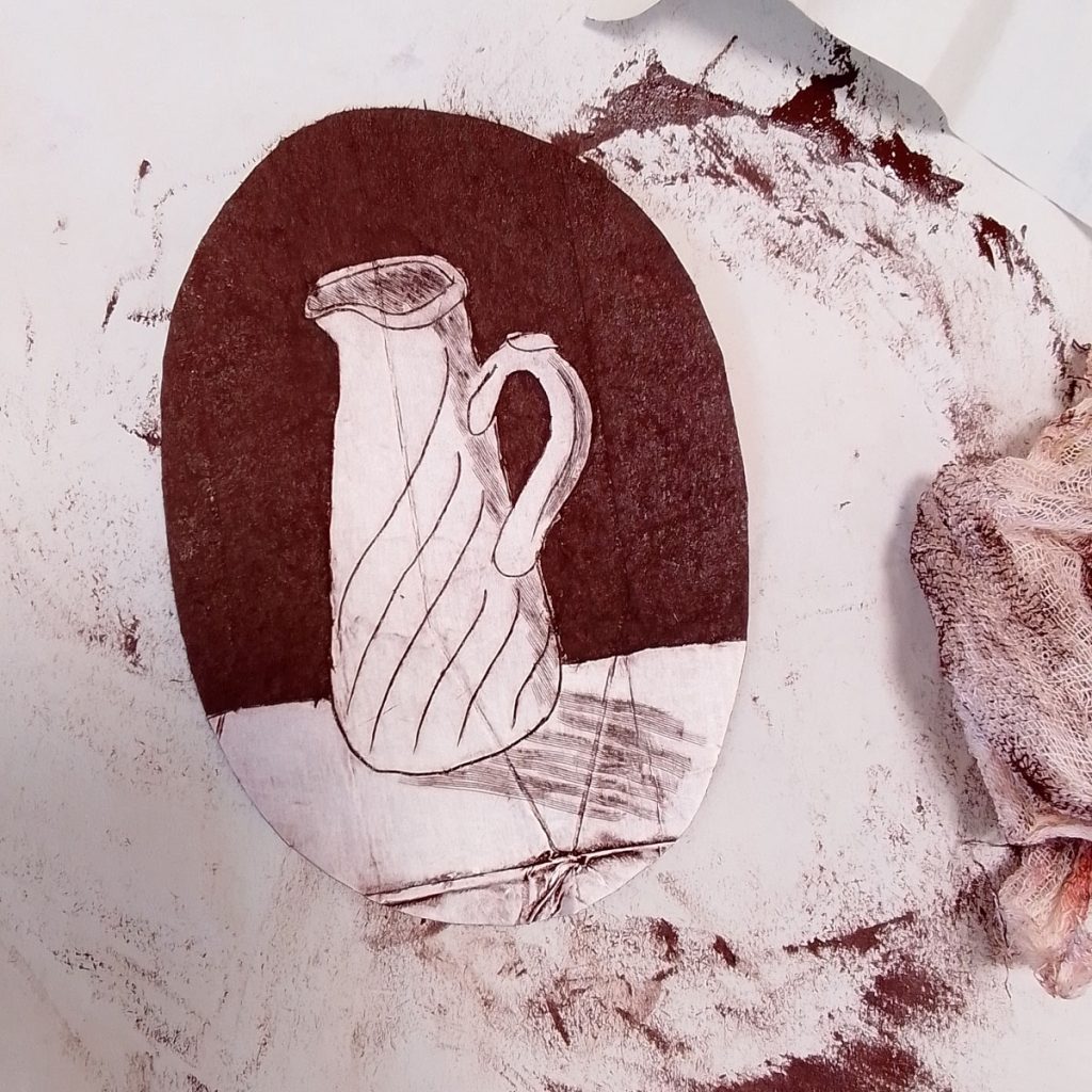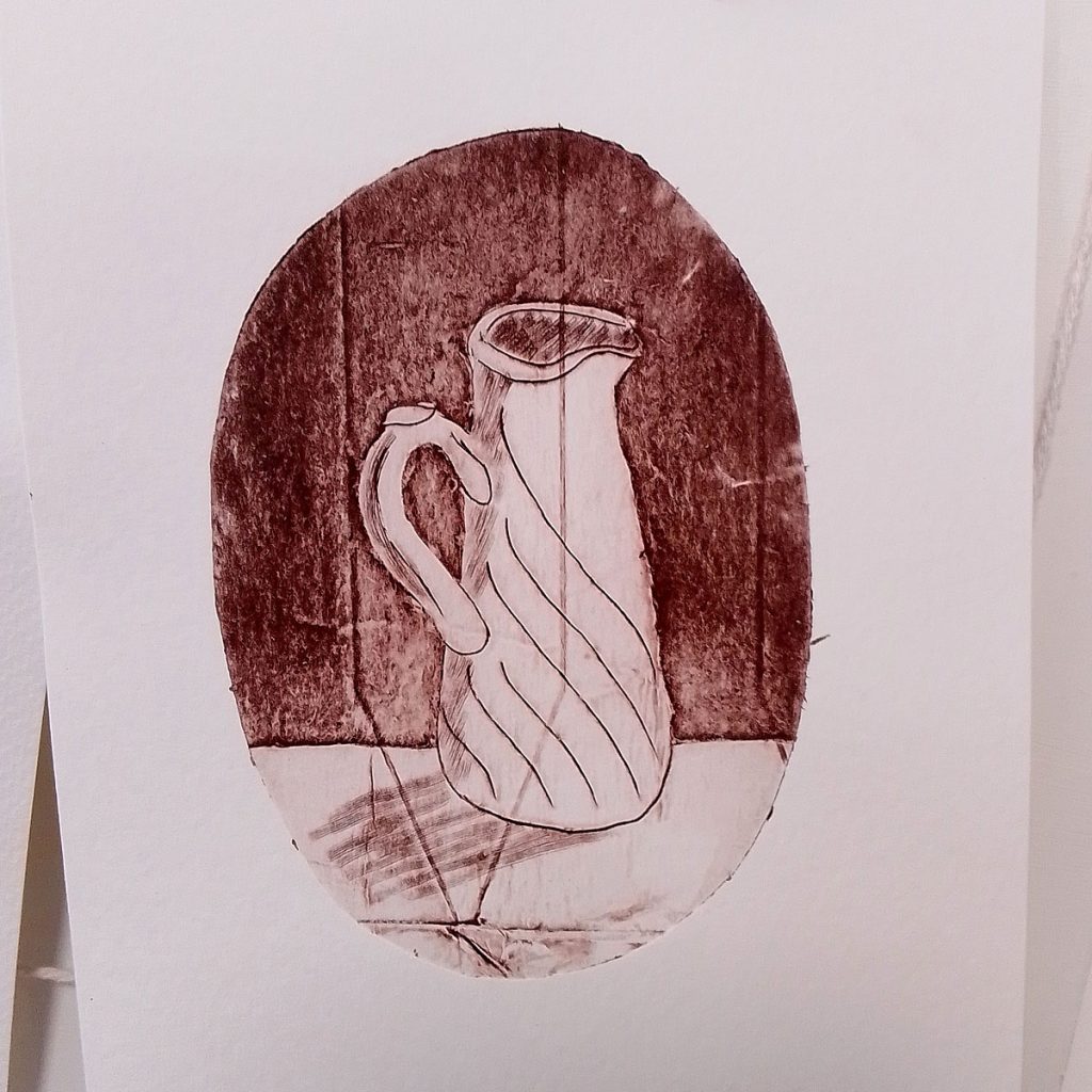 To use a carton, open it out, make sure it’s thoroughly clean, and etch into the plasticy foil that is on the inside of the carton. I worked on three different prints, a jug, a bunch of snowdrops and a crab apple blossom. If you would like areas of dark tone, then you can rip off the foil in these areas – see the jug etching below.