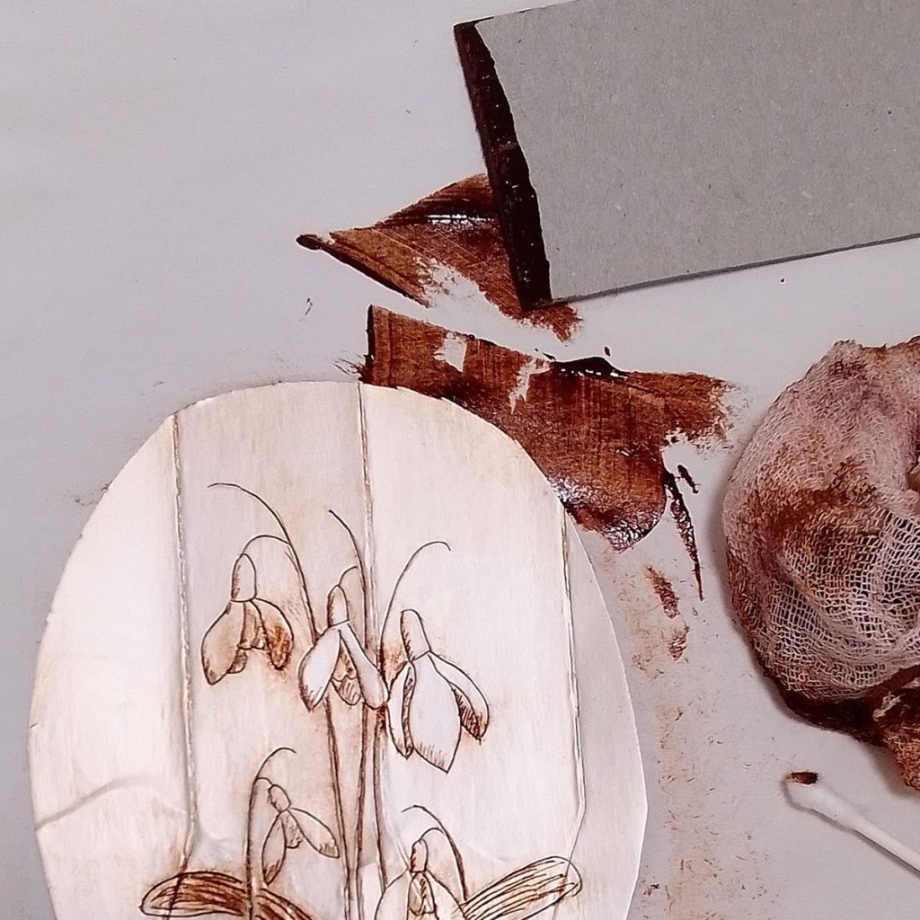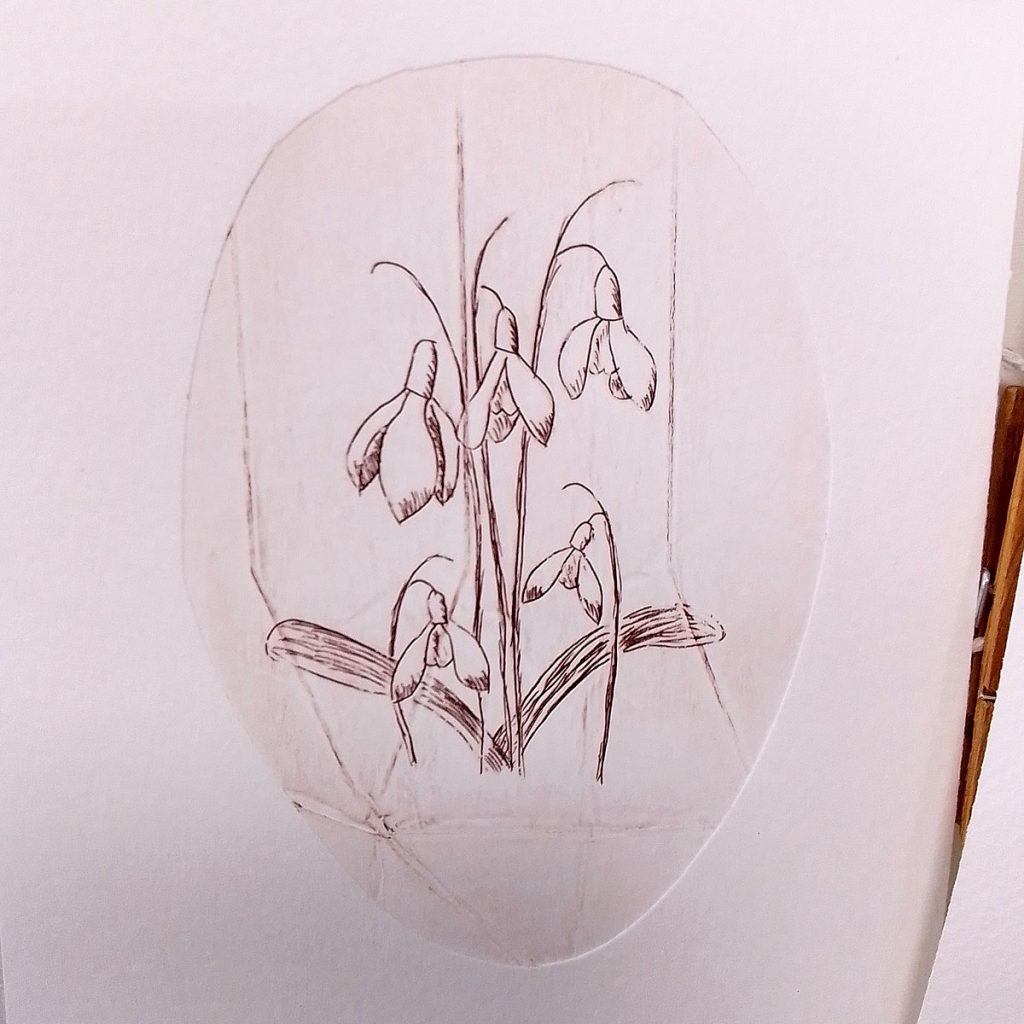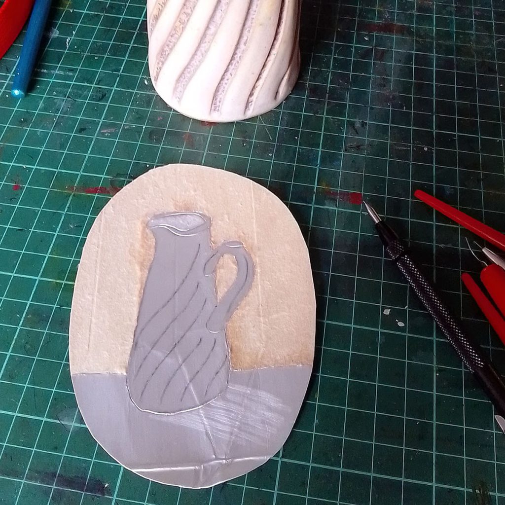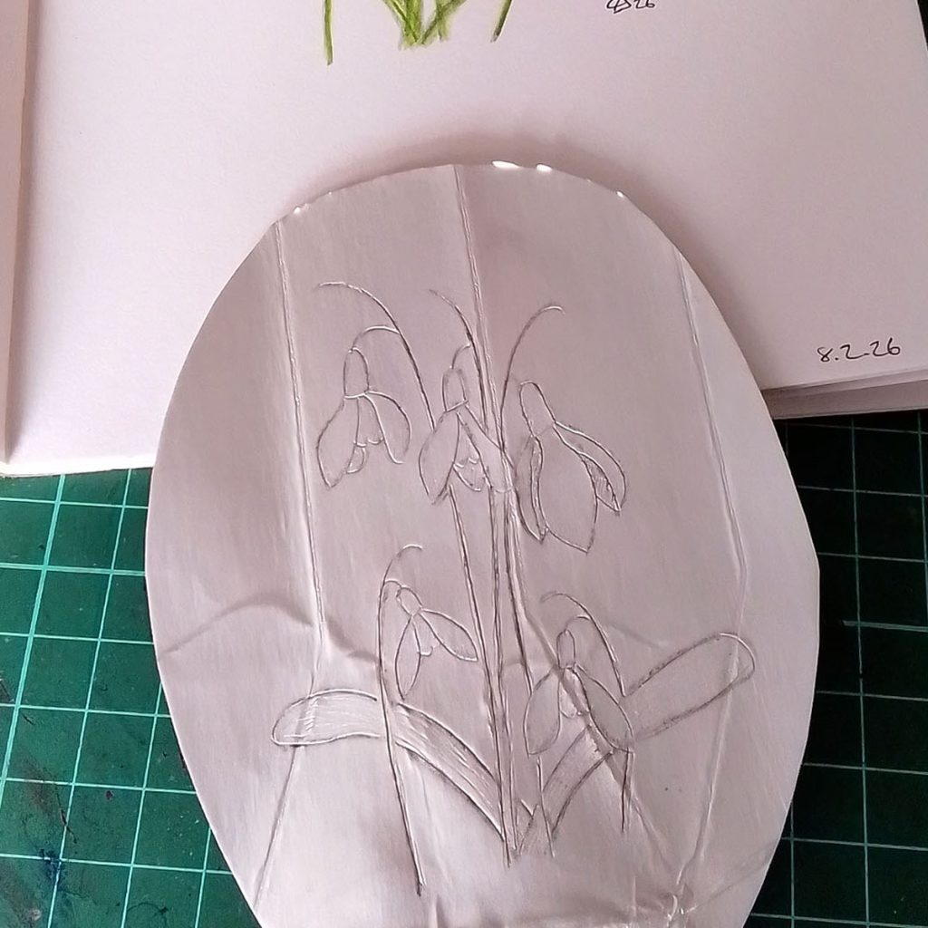 To use a carton, open it out, make sure it’s thoroughly clean, and etch into the plasticy foil that is on the inside of the carton. I worked on three different prints, a jug, a bunch of snowdrops and a crab apple blossom. If you would like areas of dark tone, then you can rip off the foil in these areas – see the jug etching below.
