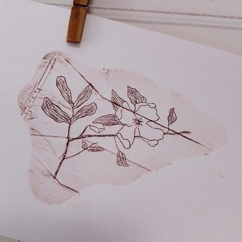 I printed using damp paper and ran the plate and paper through my Sizzix Big Shot Plus machine to take the prints. I used a watercolour paper by Fabriano, I think it’s around 200gsm, but as it was on sale it didn’t have any details with it!